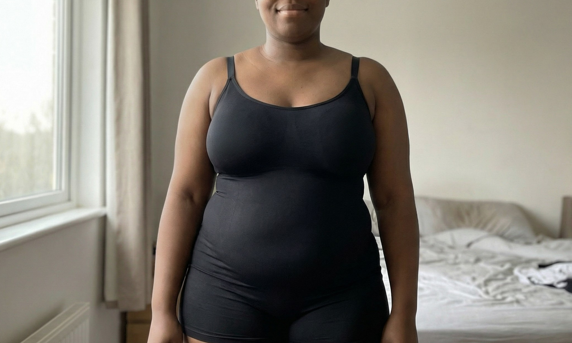 This comparison shows the same body before and after wearing shapewear. There is no weight loss or physical transformation involved — the difference comes from gentle support under clothing, creating a smoother, more balanced appearance.