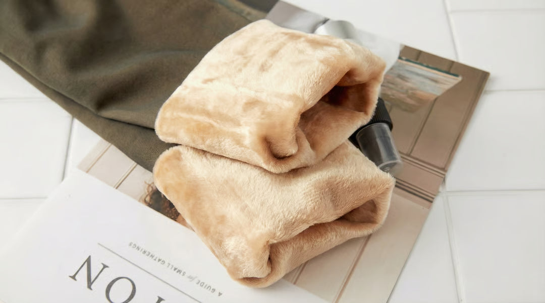 This comparison highlights the difference between ordinary winter tights made with thin, stiff fabric and fleece lined tights designed for cold weather. While basic materials allow cold air to pass through and feel rough on the skin, the soft fleece lining provides a warmer, cozier feel from the first wear. The outer layer remains smooth and translucent, while the interior feels plush and comfortable, making winter outfits noticeably more comfortable without added bulk.